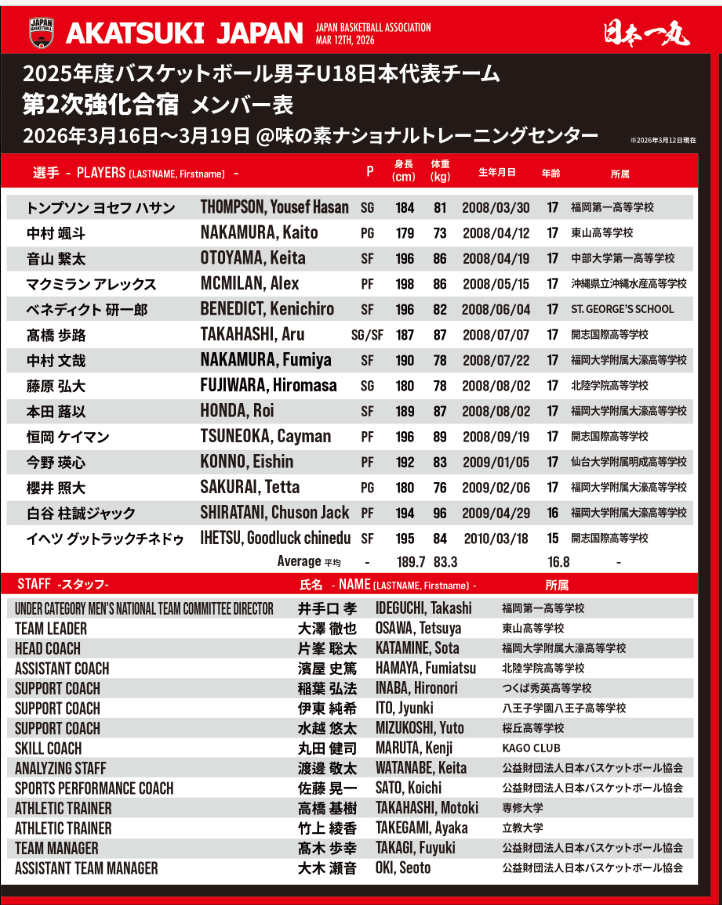 #AkatsukiJapan 男子U18日本代表 3月16日(月)より2025年度バスケットボール男子U18日本代表チームの第2次強化合宿を開催いたします