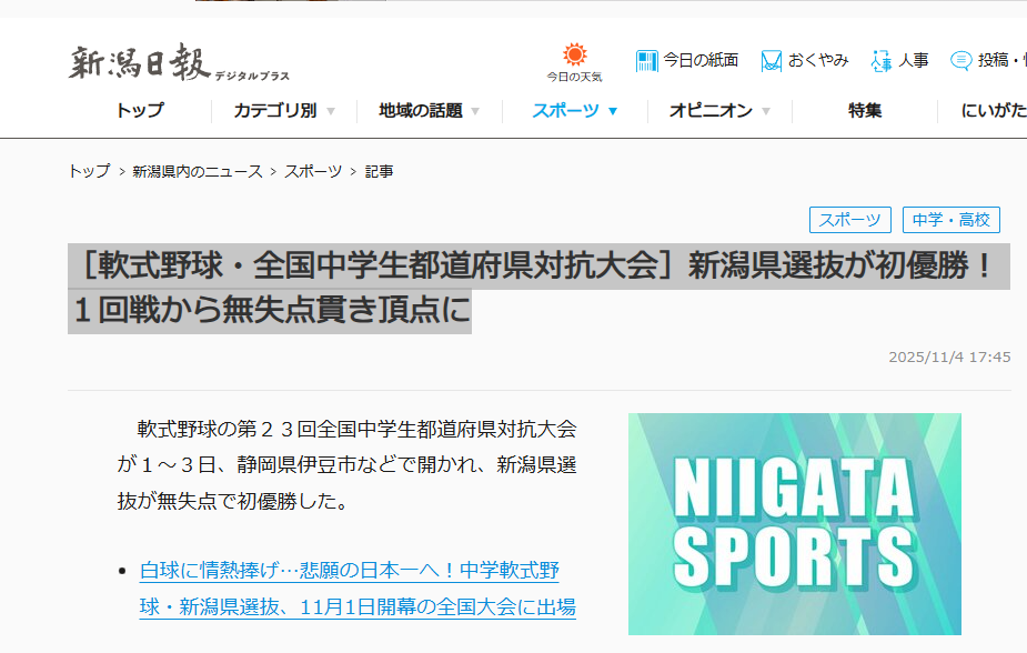 ■[軟式野球・全国中学生都道府県対抗大会]新潟県選抜が初優勝!1回戦から無失点貫き頂点に