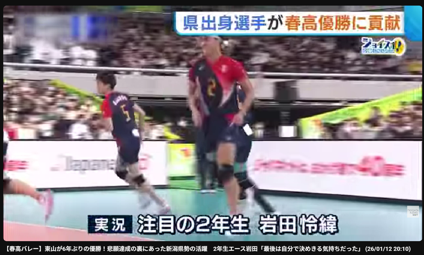 春の高校バレーは11日に決勝戦が行われ、東山(京都)と清風(大阪)が対戦。2年生エースの岩田怜緯(中之口中学校出身)、齋藤航(越路中学校出身)、小澤風雅(糸魚川中学校出身)と新潟県勢3人が先発メンバーに名を連ねた東山が、セットカウント3-1で清風を破り、6年ぶり2度目の優勝を果たしました。