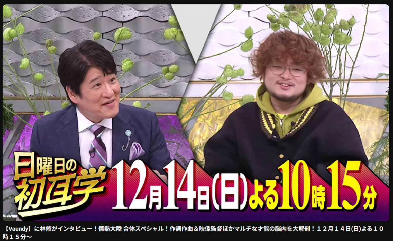 ■【Vaundy】に林修がインタビュー!情熱大陸 合体スペシャル!作詞作曲&映像監督ほかマルチな才能の脳内を大解剖!12月14日(日)よる10時15分〜